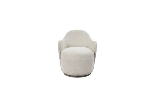 The Trilogy Barrel Chair features a curved silhouette with plush Ivory upholstery, complemented by a rich Cocoa wood frame for a warm contrast. Designed for comfort and style, its barrel shape offers a cozy, sophisticated touch to any living space